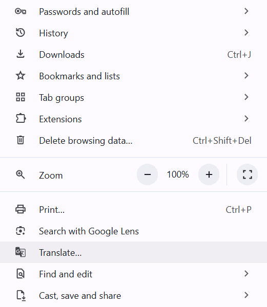 If no icon appears, click the three dots (⋮) in the top right corner, select Translate, and choose your language.