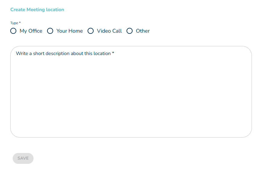 Choose from My office, Client’s home, or Other, and add a short description (for example, “Available via video conference using Zoom or Teams”).